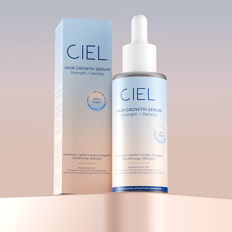 CIEL Hair Growth Serum is a high-performance formula that strengthens hair to reduce hair-fall and stimulate hair growth. It is powered by clinically dosed, Proven ingredients that are designed to prolong the growth phase of the hair cycle, nourish the scalp and trigger hair follicle regeneration. Enriched with award-winning peptides and extracts, this serum offers protection from environmental stressors for healthier, stronger hair that maintains its vitality over time. Users notice a reduction in hair thinning and a significant improvement in hair density in 3 months of regular use.