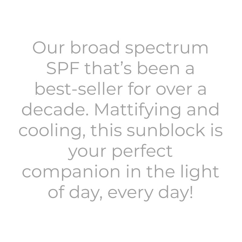 This sunblock offers superior broad-spectrum protection against sun-burn, sun-tan and premature skin-ageing. It subsides inflammation and visibly calms irritated skin.